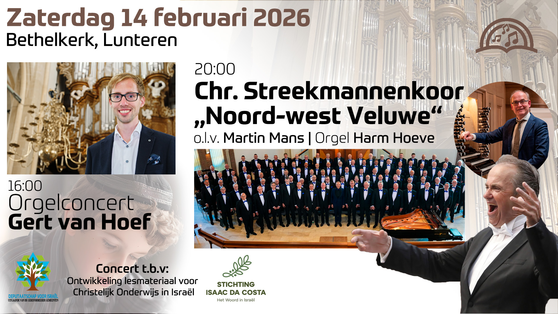 Bethelkerk, Lunteren De Haverkamp 1, Lunteren, Gelderland, NederlandZaterdag 14 februari 2026 organiseert SCMAF een tweetal concerten in de Bethelkerk van Lunteren. Om 16.00 zal Gert van Hoef een orgelconcert verzorgen en om 20:00 zal het Christelijk Streekmannenkoor "Noord-west Veluwe" olv Martin Mans een koor & samenzang verzorgen. Het koor wordt deze avond begeleid op het orgel door Harm Hoeve.