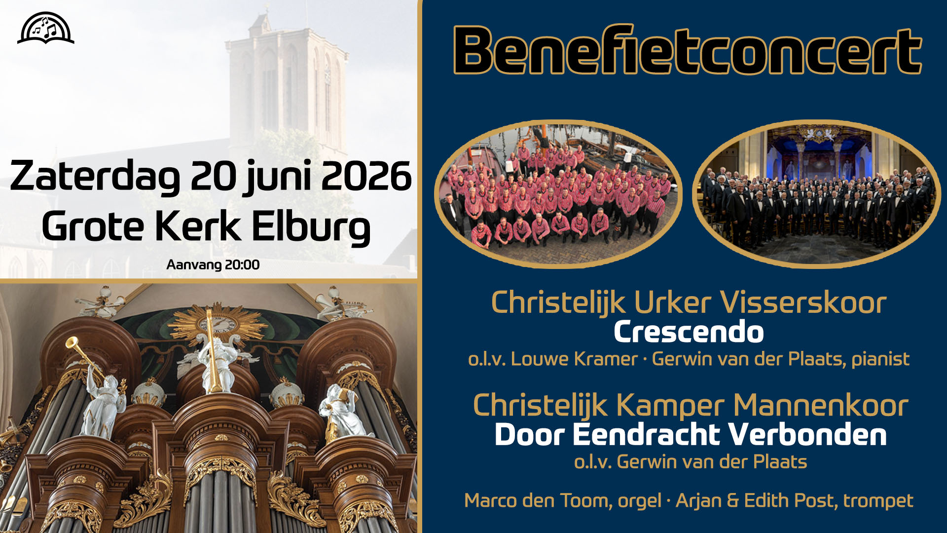 Grote Kerk, Elburg Zuiderkerkstraat 1, Elburg, Gelderland, NetherlandsZaterdag 20 juni 2026 organiseren wij een groots korenconcert in de Grote kerk van Elburg. Aan dit concert werken mee: Christelijk Kamper Mannenkoor 'Door Eendracht Verbonden' o.l.v. Gerwin van der Plaats Christelijk Urker Visserskoor 'Crescendo' o.l.v. Louwe Kramer Marco den Toom, orgel Arjan en Edith Post, trompet De opbrengst van dit concert is o.a. bestemd […]